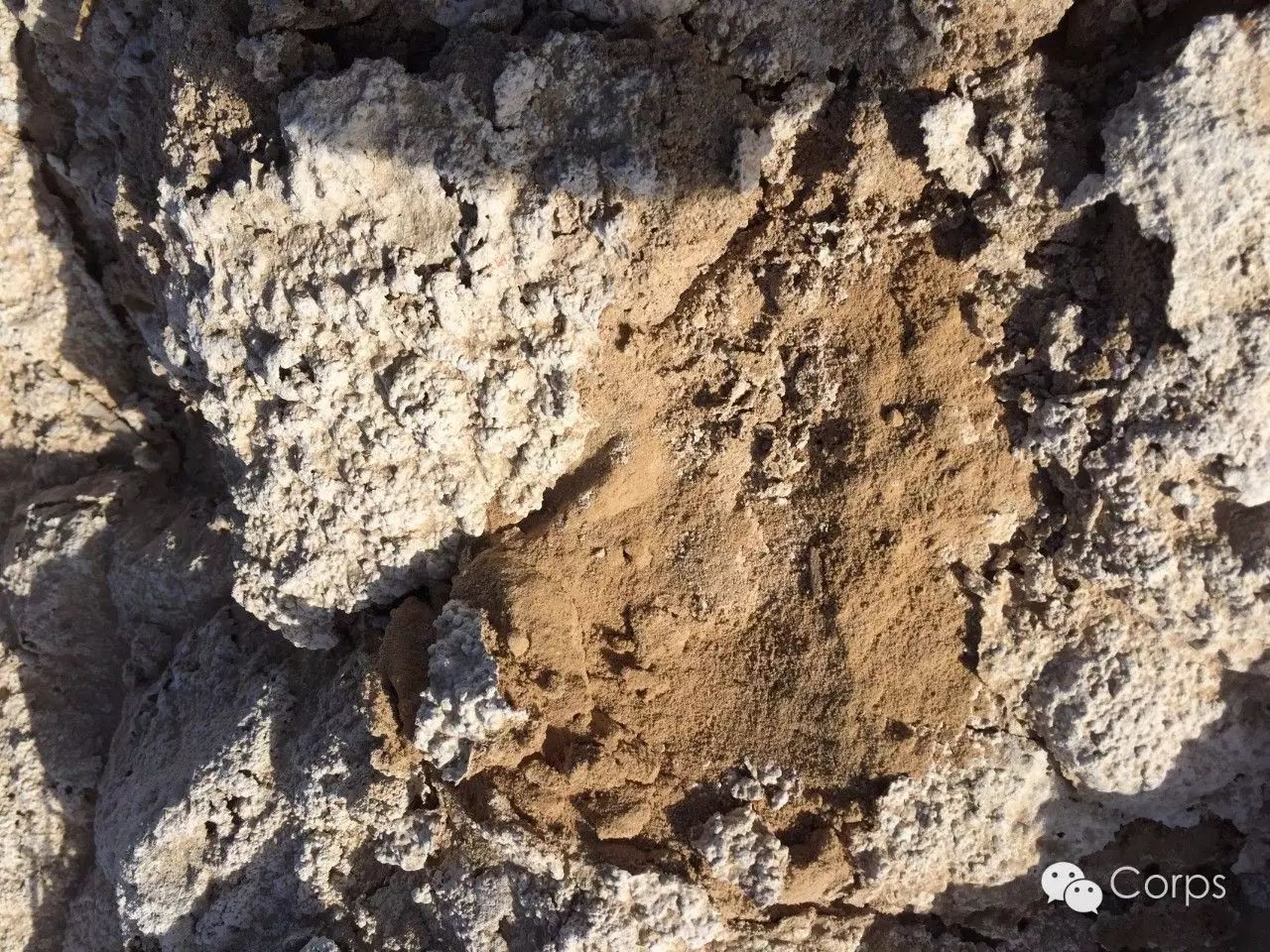 上圖是筆者2016年拍攝于青海的鹽土,已經形成明顯的鹽結皮。結皮下面蓬松,白色表聚物,不是很咸,發涼。這是以硫酸鹽為主、其次為氯化物的鹽土,土壤pH均不高。