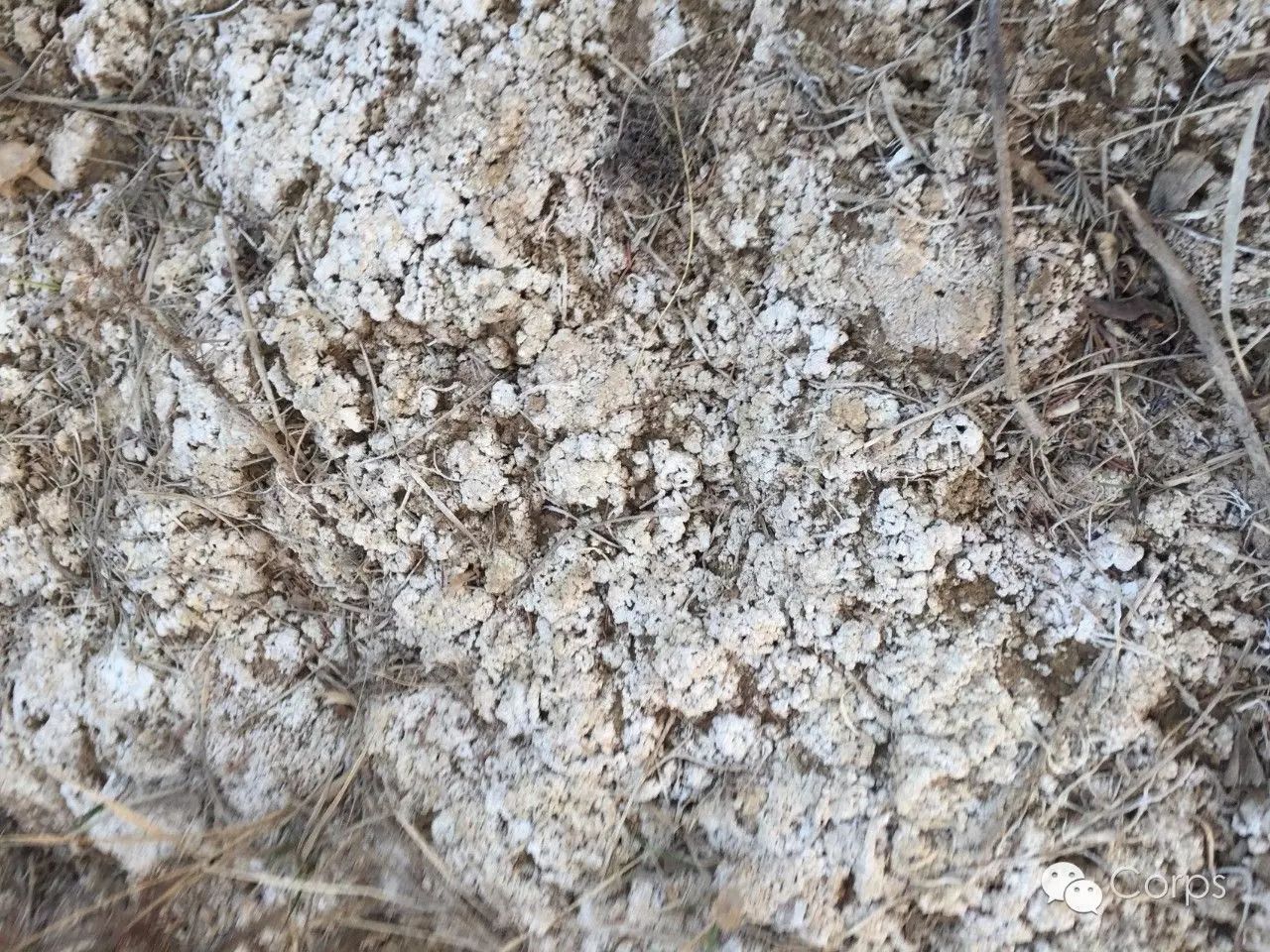 上圖是筆者拍攝于甘肅武威的鹽土,土壤酸堿度不高,pH8.2左右。上圖是典型的草甸鹽土,呈蘑菇狀,由于地表蒸發鹽分表聚形成,一般僅表層鹽分較高。通常主要離子組成為硫酸根+鎂離子、鉀離子、鈉離子。由于鎂離子、鈉離子含量較高,很容易形成帶結晶水的硫酸鎂、硫酸鈉,鹽霜下面通常較濕潤。由于鹽分表聚嚴重,通常幼苗根系較淺時,死棵嚴重。該地塊種植苗木,幼樹死亡率高,大樹死亡率低。符合草甸鹽土特征。